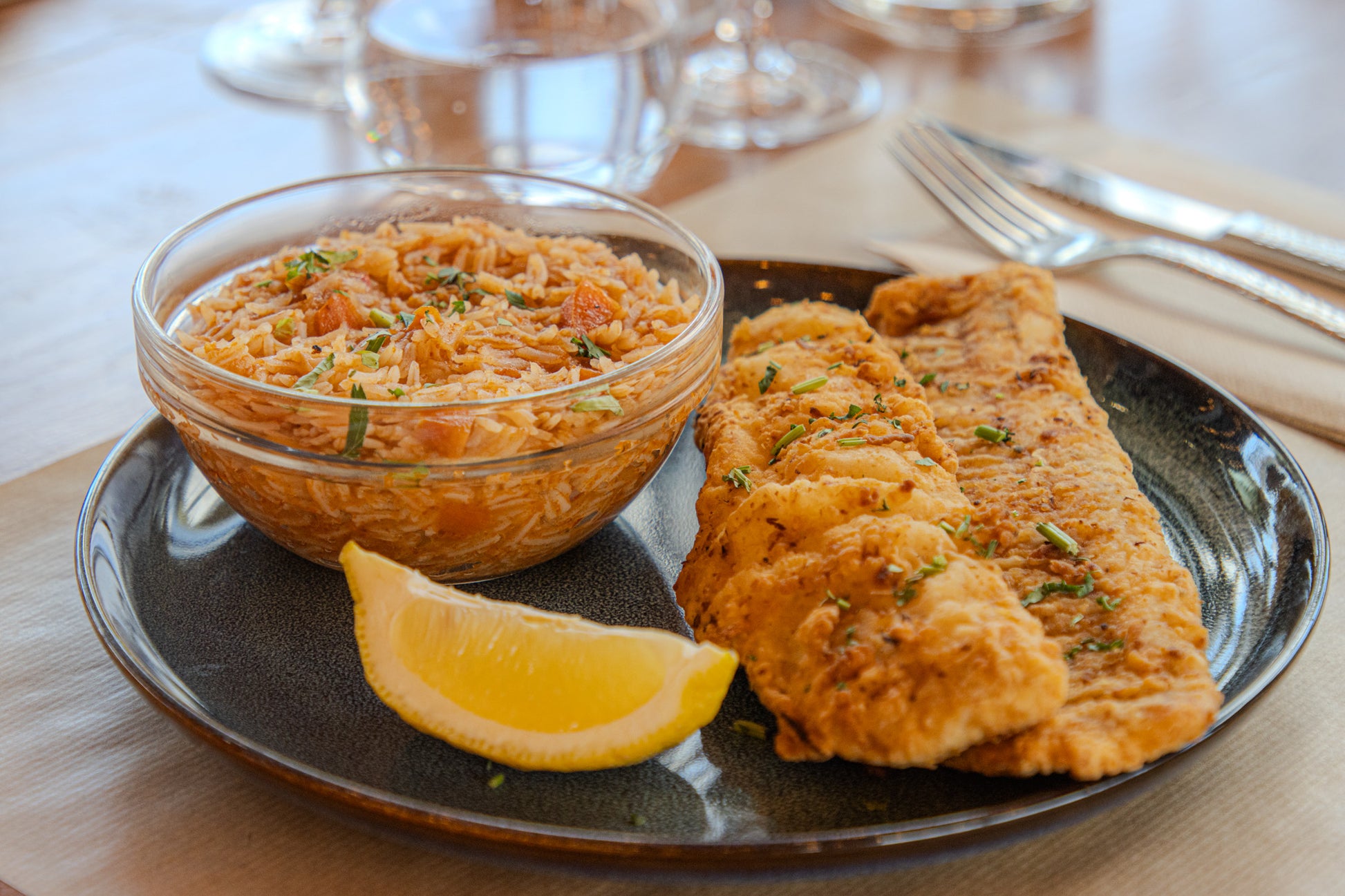 Filetes de pescada levemente temperados e grelhados na chapa, garantindo uma textura delicada e sabor suave. Servidos com um arroz de tomate cremoso, preparado com ingredientes frescos e um toque caseiro que realça os sabores do mar.