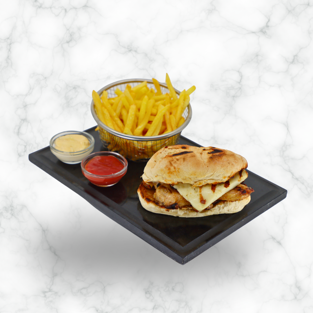 Pão rústico, maionese de alho e queijo, sobrecoxa de frango sem osso grelhado, queijo coalho derretido e cheiro-verde fresco.