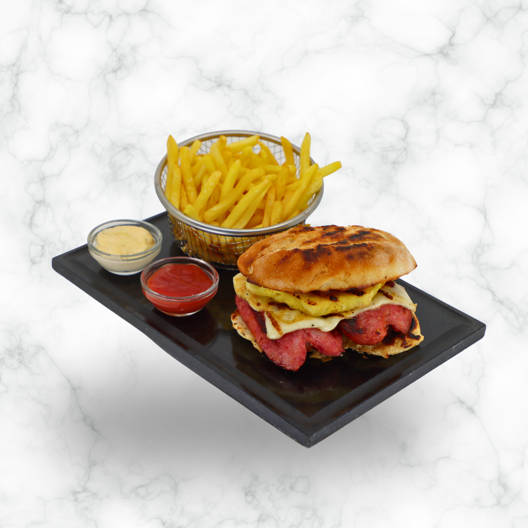 Inclui sandes artesanais , batatas fritas crocantes , dois molhos e refrigerante à escolha .